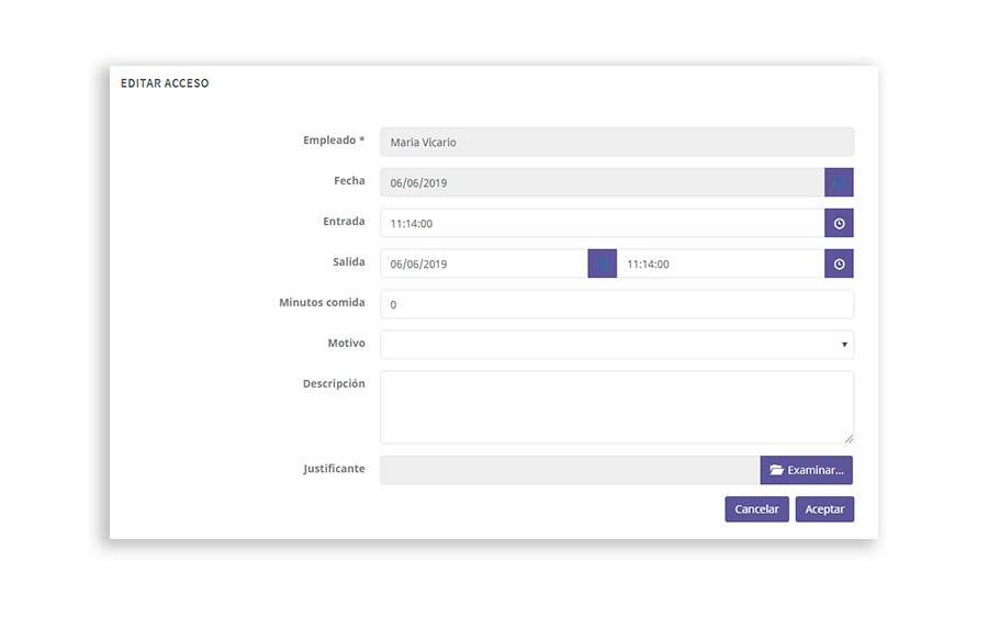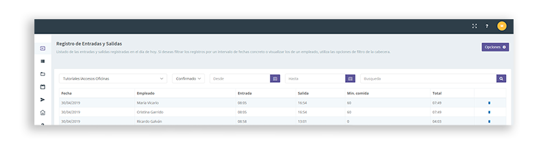Desde la vista de entrada y salidas el supervisor puede registrar una modificación pulsando el icono editar situado a la derecha de cada registro. Las modificaciones únicamente se aplican en caso de errores y siempre generan una pista de auditoria, junto con la notificación al empleado.