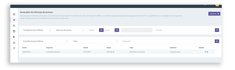 Los informes de accesos permiten generar informes más descriptivos, por ejemplo el resumen de dedicación por empleado, para ser consultados en pantalla o mediante descarga en formato Excel. Los informes no se generan en el momento de la solicitud, ésta queda registrada e iAccesos los procesa en función del orden de registro de solicitudes.