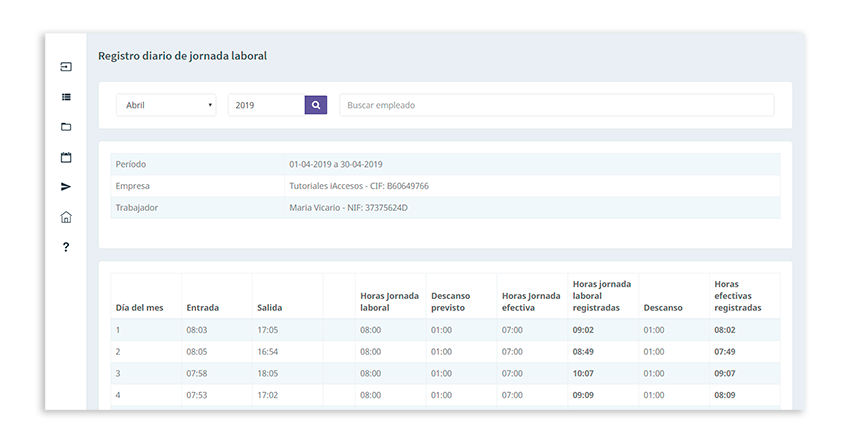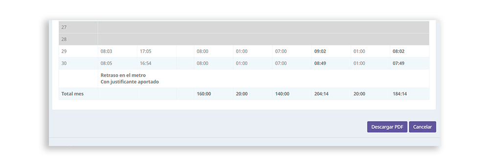Permite consultar y generar el informe mensual de entradas y salidas de un empleado con el detalle diario y el acumulado de horas de jornada efectiva en base a la configuración de franjas horarias aplicada.