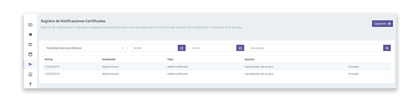 El módulo de notificaciones certificadas reúne todas las notificaciones enviadas a los empleados desde los diferentes módulos de iAccesos. Cada notificación genera un acta de evidencias que permite acreditar frente a terceros el contenido de la comunicación, la cuenta de destino, el resultado del intento de entrega y el instante cierto de la transacción.